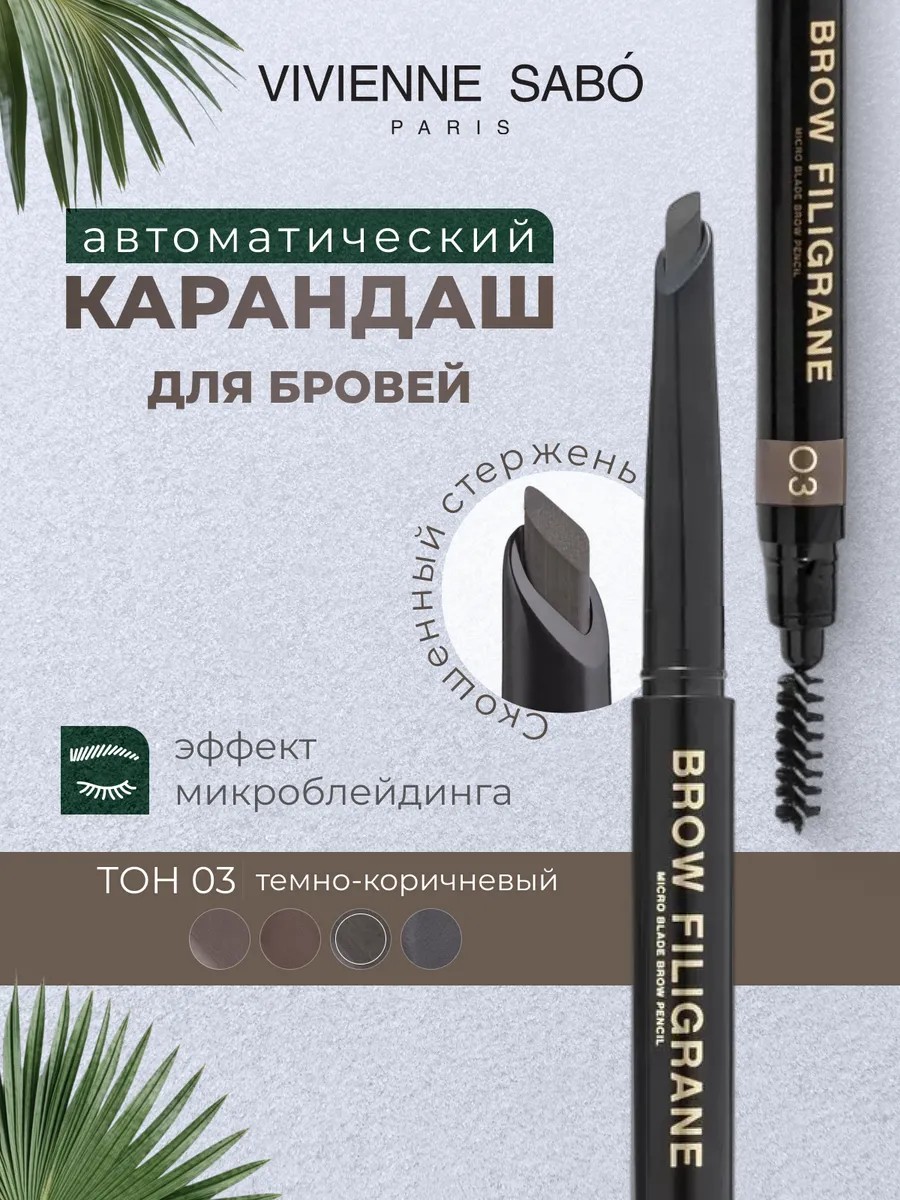 Vivienne sabo карандаш для бровей темно-коричневый Filigrane 03 с выдвижным грифелем и эффектом микроблейдинга. Это идеальный механический инструмент для профессионального макияжа бровей, сочетающий тонкий ультраплоский скошенный стержень и мягкую текстуру для комфортного нанесения.