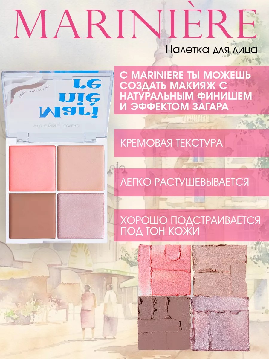 Mariniere 4-in-1 sculpting face palettes with a seaside vibe for beautiful, natural contouring. Creamy textures help you define cheekbones, add a soft flush, and a subtle glow. Each palette contains a sculpting foundation, bronzer, blush, and highlighter in universal shades. They blend smoothly and adapt perfectly to your skin tone. With Mariniere, you can create makeup with a natural finish and a tanned effect, and the packaging design will definitely remind you of a seaside vacation.