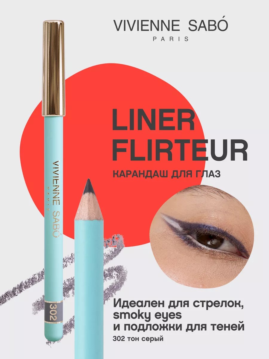 The Vivienne Sabo Liner Flirteur eyeliner pencil creates flawless lines and an expressive look. Shade 302 gray. The Vivienne Sabo eyeliner pencil creates unique, precise lines, creates smoky eyes, or provides a base for eyeshadow. The soft lead glides easily over skin without scratching or irritating even the most sensitive mucous membranes. The pencil, made with natural wax, ensures long-lasting makeup that doesn't smudge or fade all day long. This kohl pencil can create both thin, precise lines and softly blended ones. The liner is versatile for creating a variety of beauty looks, from natural daytime to vibrant evening makeup. The palette includes 7 shades: black, gray, brown, blue, dark green, blue-gray, and milky. The stylish Tiffany-colored design and compact size make it easy to store in any makeup bag. Vivienne Sabo decorative cosmetics are not tested on animals. HOW TO USE: Start drawing the wing from the middle of the eyelid, gradually widening the line toward the outer corner of the eye. Then, move on to the inner corner of the upper eyelid. To add depth and highlight the color of your eyes, fill in the spaces between the lashes and apply the texture to the lid.