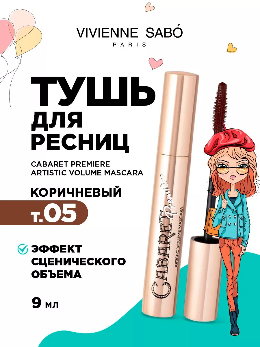 Vivienne Sabo Cabaret Premiere Artistic Volume Mascara, shade 05 brown. Volume: 9 ml. Vivienne Sabo presents her sensational Cabaret Premiere mascara with a stage effect. With this legendary and acclaimed mascara, your lashes will become bright and noticeable, and your eyes will be open and expressive. Cabaret Premiere is more than just a mascara; it is a true star among decorative cosmetics for eye makeup. It combines a rich brown color, long-lasting wear, and a unique formula that provides unrivaled volume and lengthening of lashes. The Viviene Sabo Cabaret Premiere collection not only offers classic black but also ultra-fashionable bright shades: Violette, Blue, Green, and Brown, allowing you to experiment with your look and create a unique makeup look every day. The Cabaret Premiere mascara's plastic brush is unique: it has a tapered tip that helps distribute the mascara evenly across lashes, separating and perfectly coating each lash. This creates the dramatic volume you've been looking for. HOW TO USE: Apply Cabaret Premiere with a zigzag motion from the roots to the tips, pressing the brush closer to the roots and pointing upward. Look downwards when applying the mascara. This will create the most open eyes and allow you to capture hearts with just one sweep of your lashes! REMOVABLE WITH EVERY CLEANSING MATTER. Each product undergoes strict quality control, guaranteeing safety. Suitable for girls and their mothers, it makes a great gift for Valentine's Day and March 8th for a girlfriend, mother, friend, teenager, sister, woman, or colleague. Brown mascara will not only give you the look of false or laminated lashes but will also make the process of applying your makeup a pleasure. Don't miss the opportunity to try Viven Sabo's brown mascara and add it to your makeup bag!