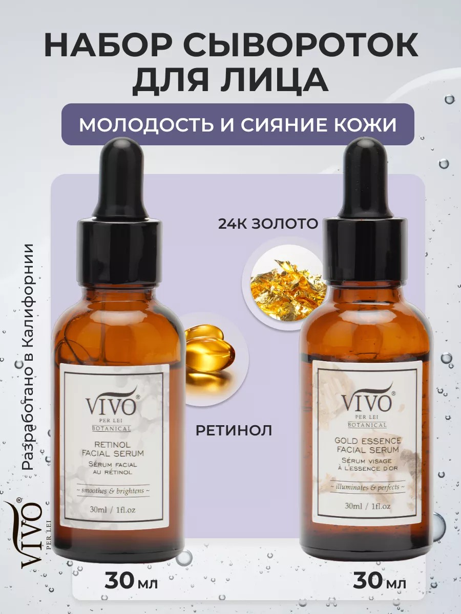 The Vivo Per Lei brand offers several anti-aging facial serums with various active ingredients. These facial serums effectively work as facial treatments, providing hydration, nutrition, and firmness, evens out the tone of problem skin, improves elasticity, has a pronounced lifting effect, and fights wrinkles. Directions for use and ingredients are indicated in the picture for each serum.