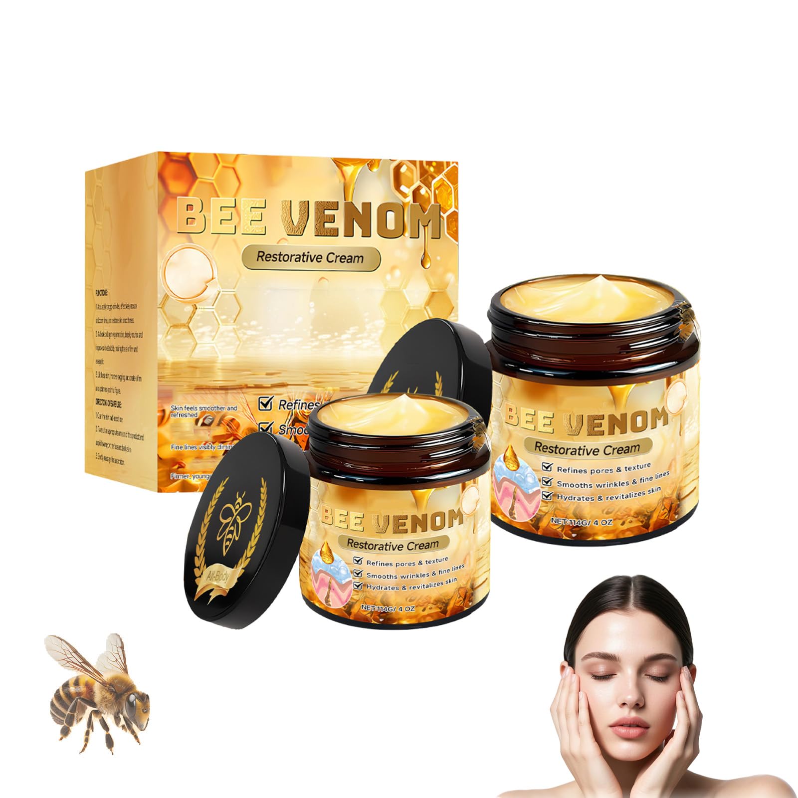 Professional Bee Venom Cream with Honey and Peptides - The ultimate anti-aging moisturizer for firming skin for women. Firming treatment for the face and neck, reducing deep wrinkles and improving collagen. Moisturizing blend for eliminating, lifting, and restoring fine lines. Suitable for sensitive skin with regular use. Item Name: Bee Venom Cream Net Weight: 114g Shelf Life: 3 years Package Includes: 1 2 3 5 Jars Bee Venom Cream NOTE: 1. Please allow 1-2cm differences due to manual measurement. 2. Due to different displays and lighting, the image may not reflect the actual color of the item. Thank you for your understanding. About after-sales service: If you encounter any problems while purchg or using our products, please contact us promptly. We are available 24 hours a day. SAFETY WARNING Please store in a cool, dry place and avoid direct sunlight. Keep out of reach of children.