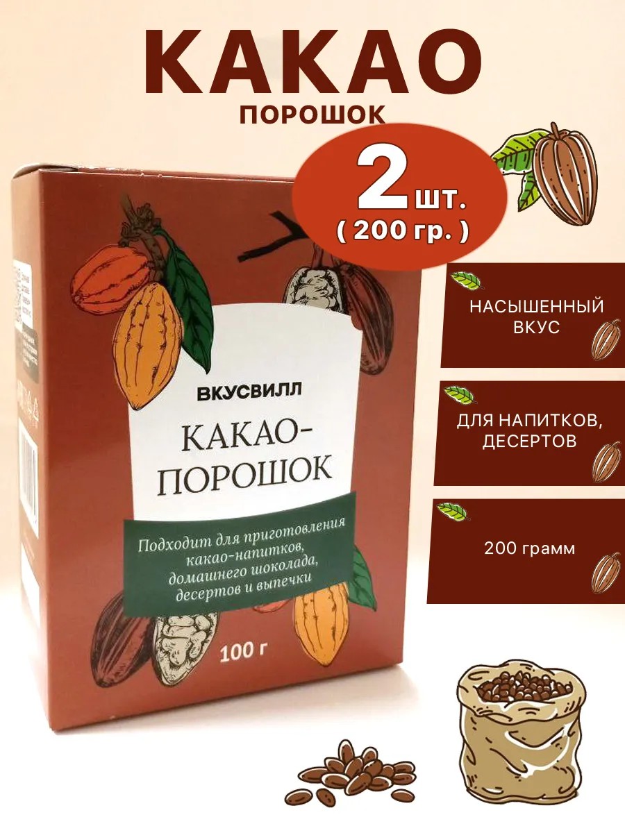 | Комплектация | какао-порошок 200 грамм (2 упаковки по 100 грамм) |