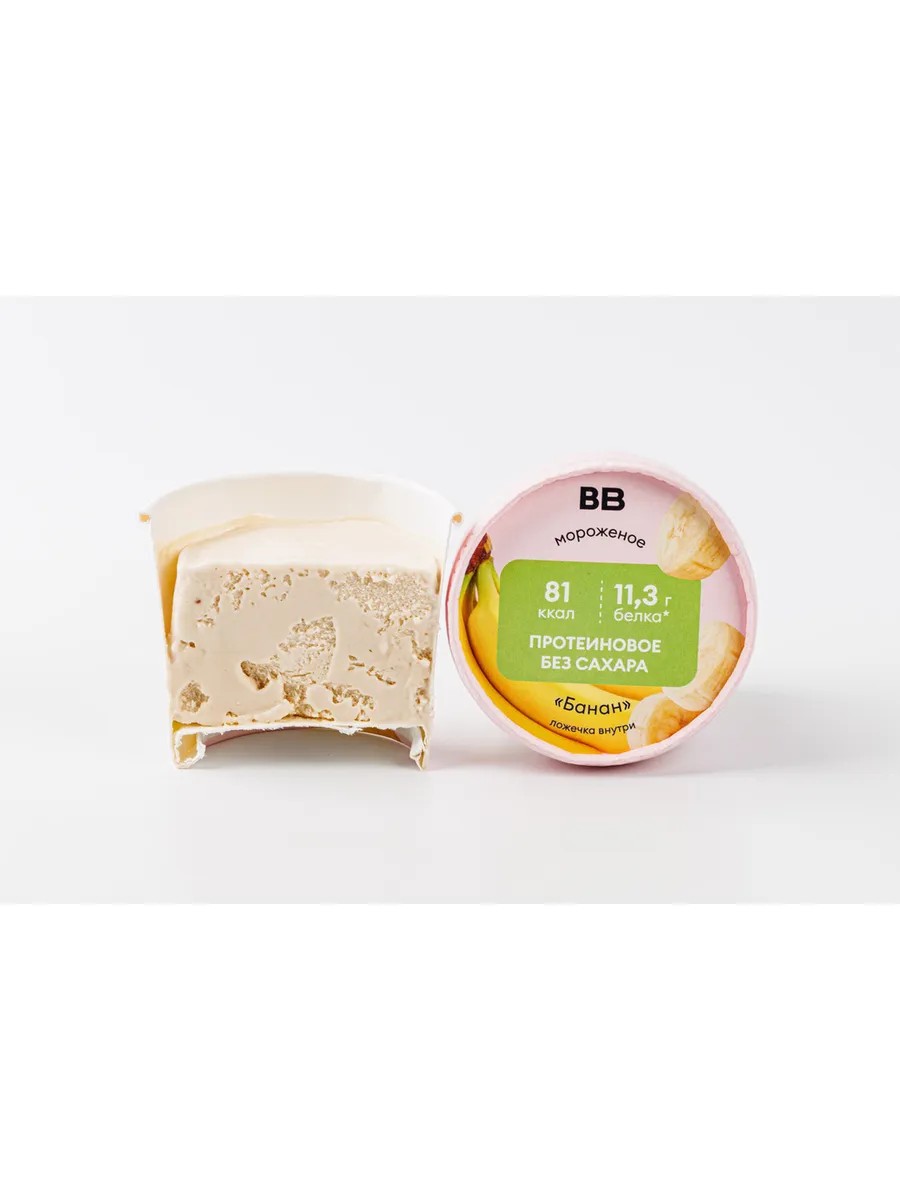 Протеиновое мороженое на сывороточном белке и сливках. Деликатную сладостью лакомству придаёт изомальт, а насыщенный фруктовый вкус — пюре спелых бананов.
