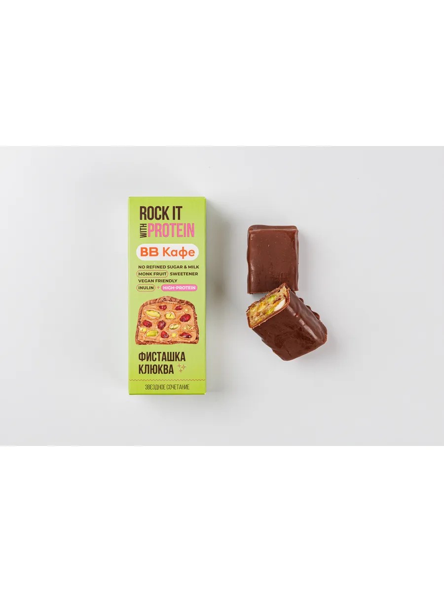 A nut-protein bar with pistachios, cranberries, cashews, and monk fruit extract, coated in chocolate. Contains no white sugar or dairy ingredients. Contains dietary fiber. Suitable for vegans. Available for delivery and in stores with a cafeteria.