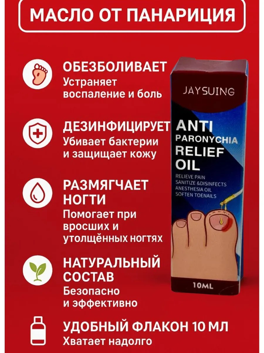 Лечебное масло для ногтей — эффективное средство при воспалении околоногтевой кожи и вросших ногтях на ногах. Благодаря натуральным компонентам, включая масло чайного дерева и экстракты растений, масло оказывает противовоспалительное, антисептическое и смягчающее действие. Оно помогает снять покраснение и отёк, облегчает дискомфорт, способствует восстановлению кожи и росту здоровой ногтевой пластины.