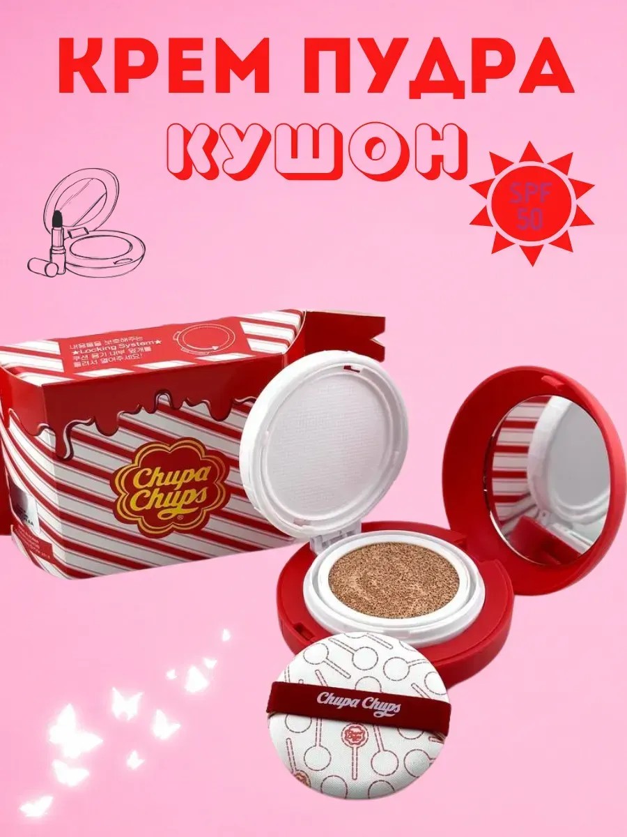 Тональная основа-кушон SPF 50+ PA +++ (Chupa Chups Candy Glow Cushion SPF 50+ PA +++) Высокопигментированный кушон выравнивает тон и корректирует текстуру кожи. Тонкий слой средства перекрывает покраснения, следы от прыщиков и пигментацию. Не подчеркивает шелушения, не трескается и не стекает в течение дня. Даёт естественный сияющий финиш без эффекта маски. Содержит максимальный SPF 50+ PA++++, ниацинамид, гиалуроновую кислоту, аденозин, чтобы ухаживать за кожей весь день.