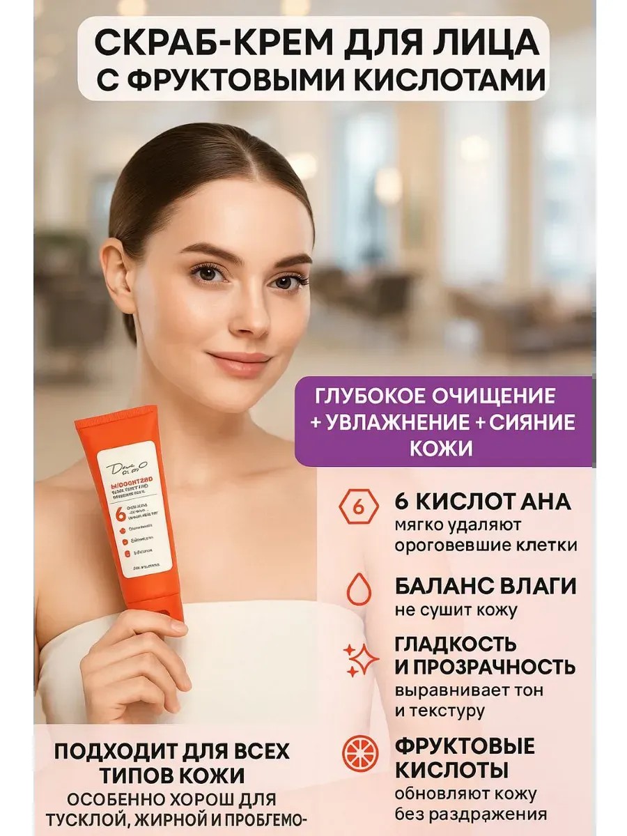 Крем-скраб для лица с кислотами — это эффективное средство для глубокого очищения кожи, удаления ороговевших клеток и выравнивания тона. Формула на основе гидроксикислот (AHA, BHA) бережно отшелушивает, очищает поры и помогает в борьбе с черными точками, тусклостью и прыщами.