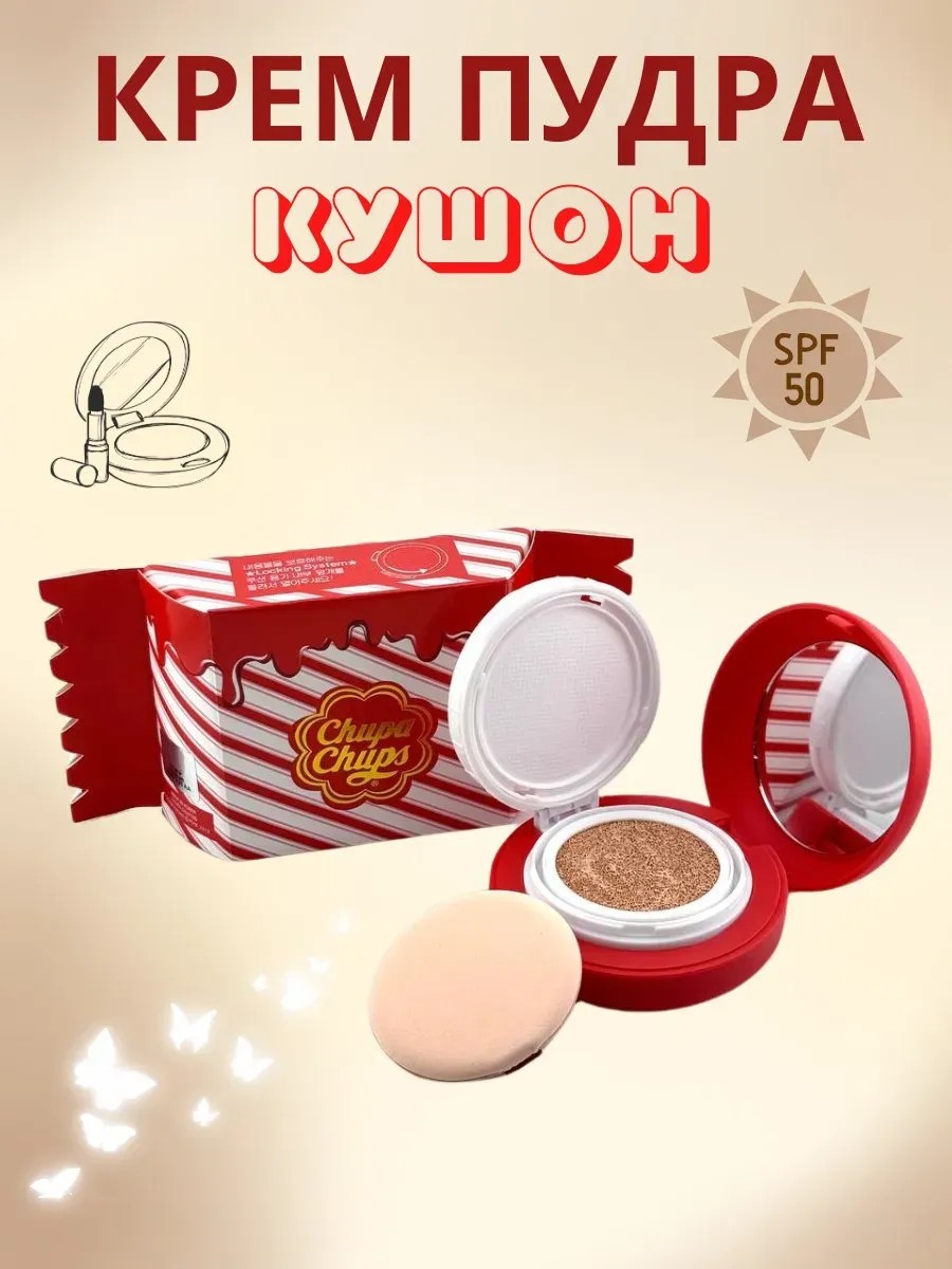 Тональная основа-кушон SPF 50+ PA +++ (Chupa Chups Candy Glow Cushion SPF 50+ PA +++) Высокопигментированный кушон выравнивает тон и корректирует текстуру кожи. Тонкий слой средства перекрывает покраснения, следы от прыщиков и пигментацию. Не подчеркивает шелушения, не трескается и не стекает в течение дня. Даёт естественный сияющий финиш без эффекта маски. Содержит максимальный SPF 50+ PA++++, ниацинамид, гиалуроновую кислоту, аденозин, чтобы ухаживать за кожей весь день.