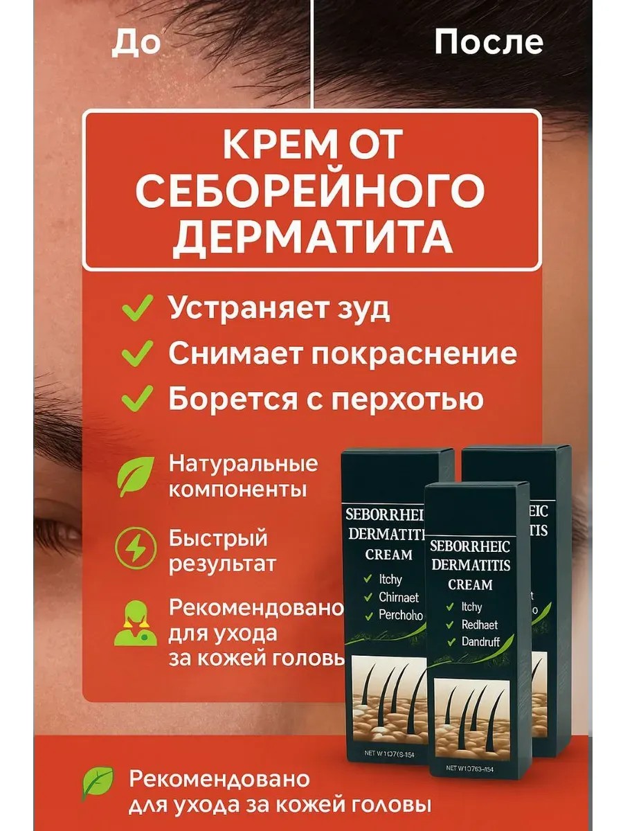 Эффективное средство от себорейного дерматита головы помогает устранить зуд, раздражение и шелушение кожи. Натуральный крем от себорейного дерматита на голове создан для бережного ухода за чувствительной кожей, склонной к воспалениям и покраснению. Лёгкая текстура быстро впитывается, не оставляет жирных следов и подходит для ежедневного применения. Благодаря активным компонентам средство глубоко питает и увлажняет кожу, устраняет стянутость и сухость, препятствует образованию перхоти и нормализует работу сальных желез.Для тех, кто ищет надёжные средства от себорейного дерматита на голове, этот крем станет оптимальным решением. Он действует точечно на очаги воспаления, снимает зуд и ощущение жжения, способствует заживлению микротрещин и восстановлению защитного барьера кожи. Применение курса помогает значительно сократить проявления заболевания и поддерживать здоровье кожи головы.Мазь от себорейного дерматита на голове с натуральными экстрактами подходит для мужчин и женщин, страдающих от перхоти, шелушений и хронической сухости. Она помогает смягчить ороговевшие участки кожи, уменьшить покраснение и дискомфорт. Особенно эффективна при таких проявлениях, как себорейный дерматит головы сухая кожа, когда требуется интенсивное питание и увлажнение.Регулярное использование укрепляет кожу, делает её более устойчивой к раздражителям и перепадам температуры, облегчает состояние при обострениях. Крем от себорейного дерматита на голове можно использовать как в комплексной терапии, так и самостоятельно в профилактических целях. Подходит для разных типов кожи, включая чувствительную и склонную к аллергическим реакциям.Если вы страдаете от сухости, зуда и покраснений кожи головы, ищете натуральное и безопасное средство, то этот крем станет вашим помощником в борьбе с себорейным дерматитом, шелушением и перхотью.