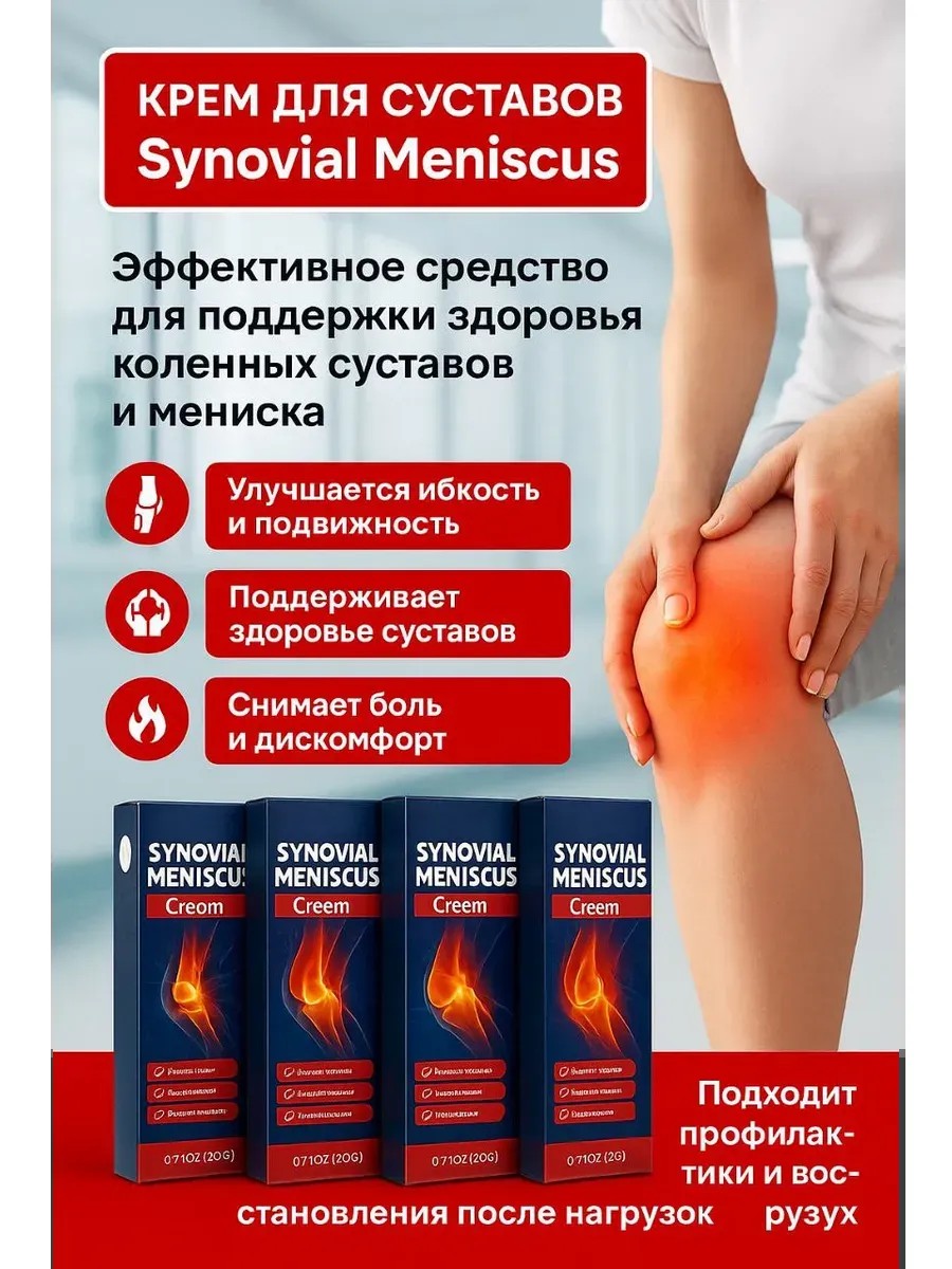 Крем для суставов Synovial Meniscus — мощное средство для лечения суставов, лечения коленных суставов, восстановления мениска, снятия боли в коленях и укрепления хрящевой ткани. Подходит при артрите, артрозе, растяжениях, ушибах, хронических болях и спортивных травмах. Этот крем для суставов и мазь для суставов обладает выраженным противовоспалительным, разогревающим и восстанавливающим действием, улучшает подвижность суставов и уменьшает отёчность.