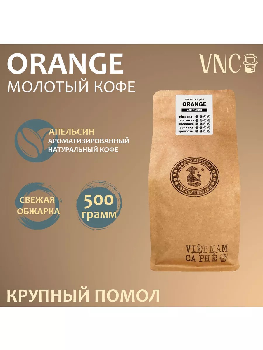Orange - взрывной, свежий и бескомпромиссный - так можно охарактеризовать этот кофе. Аромат сочного сицилийского апельсина в сочетании с нежным орехово-шоколадным кофе свежей обжарки, не оставляет равнодушным даже противников ароматизации. Модное веяние цитрусового кофе открывает новую страницу в каталоге кофейных вкусов. Натуральный аромат красного сицилийского апельсина очень удачно сочетается с естественным шоколадным вкусом вьетнамского кофе. Напиток получается гармоничным и ярким. Команда VNC создает уникальные бленды из свежеобжаренных кофейных зерен арабики, с добавлением робусты и пищевых ароматических масел, в России уже более 6 лет. Каждый год отбираем лучшие зерна из Бразилии, Вьетнама, Индии и Китая, для создания этого кофе. Все это время мы сотрудничаем с ведущей российской компанией, производящей пищевые ароматизаторы - Baker Flowers, которая обеспечивает наш кофе своими лучшими ароматами.