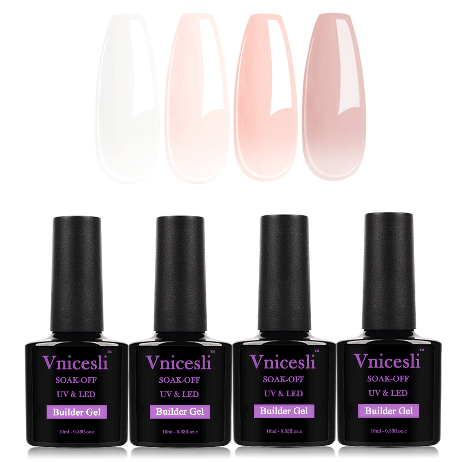 VNICESLI 5-in-1-Builder base gel, 4 pieces, 10 ml-builder gel for extension, primer, strengthening and repair of manicure, decoration adhesive Attention: Please take the skin test each time before performing a manicure.Set use immediately if you feel uncomfortable!.Durable: durable for 21+ days with a perfect shine.No notches, chips or spots.Requires drying under UV or LED lamp (curing times vary depending on the lighting system).Simple application: The integrated brush is easy to apply and helps to extend, strengthen or thicken the nails, improve the natural nail shape, create perfect curves and give the nails a smooth, natural shine.Note: It is normal for builder base to be thicker than base coat, since a certain consistency is required to extend the nails.Please shake the bottle a bit before applying or heat it with warm water to achieve better consistency.Upgraded 7 in 1 Builder Gel in a Bottle: Can be used as a builder gel, lower lacquer, nail reinforcement gel, nail repair, nail formation, apex building and sticking on tiny nail decorations. Vnicesli 5-in-1-Builder-Basisgel, 4 Stück, 10 ml – Builder-Gel für Verlängerung, Grundierung, Stärkung und Reparatur von Maniküre, DekorationskleberACHTUNG: Bitte nehmen Sie JEDES MAL DEN HAUTTEST, bevor Sie eine Maniküre durchführen. Stellen Sie die Verwendung sofort ein, wenn Sie sich unwohl fühlen!. LANGLEBIG: Langlebig für 21+ Tage mit perfektem Glanz. Keine Kerben, Chips oder Flecken. Erfordert Trocknung unter UV- oder LED-Lampe (Aushärtungszeiten variieren je nach Beleuchtungssystem). EINFACHE ANWENDUNG: Der integrierte Pinsel lässt sich leicht auftragen und hilft, die Nägel zu verlängern, zu stärken oder zu verdicken, die natürliche Nagelform zu verbessern, perfekte Kurven zu schaffen und den Nägeln einen glatten, natürlichen Glanz zu verleihen. Hinweis: Es ist normal, dass Builder Base dicker ist als Base Coat, da eine bestimmte Konsistenz erforderlich ist, um die Nägel zu verlängern. Bitte schütteln Sie die Flasche vor dem Auftragen etwas oder erwärmen Sie sie mit warmem Wasser, um eine bessere Konsistenz zu erreichen. UPGRADED 7 in 1 Builder Gel In a Bottle: kann als Builder Gel, Unterlack, Nagelverstärkungsgel, Nagelreparatur, Nagelformung, Apex Building und Aufkleben von winzigen Nagelverzierungen verwendet werden.Vnicesli 4 Stück Gel Nagellack Set, 7 in 1 Aufbaugel für Gelnägel, Klar und Nackt Builder Base Gel Für Nägel Set UV LED Gellack Klar und Nackt Gel Nagellack Set Gel Polish Kit