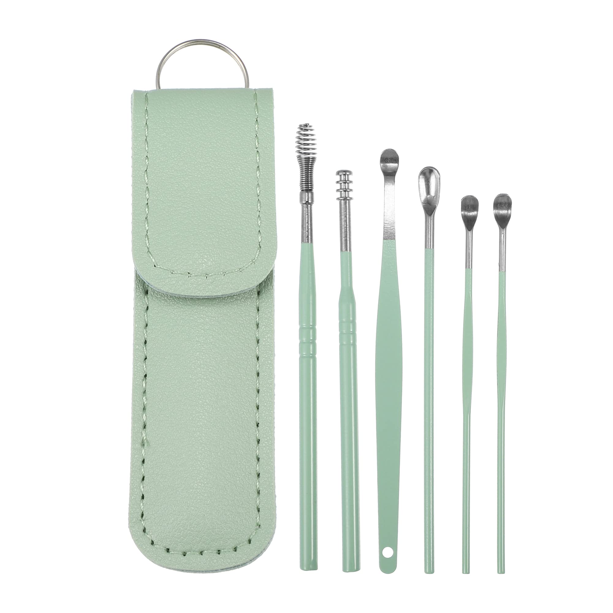 VOCOSTE 6Pcs Stainless Steel Ear Cleansing Tool Set Ear Cleaner Ear Care Set with Faux Leather Packaging Green