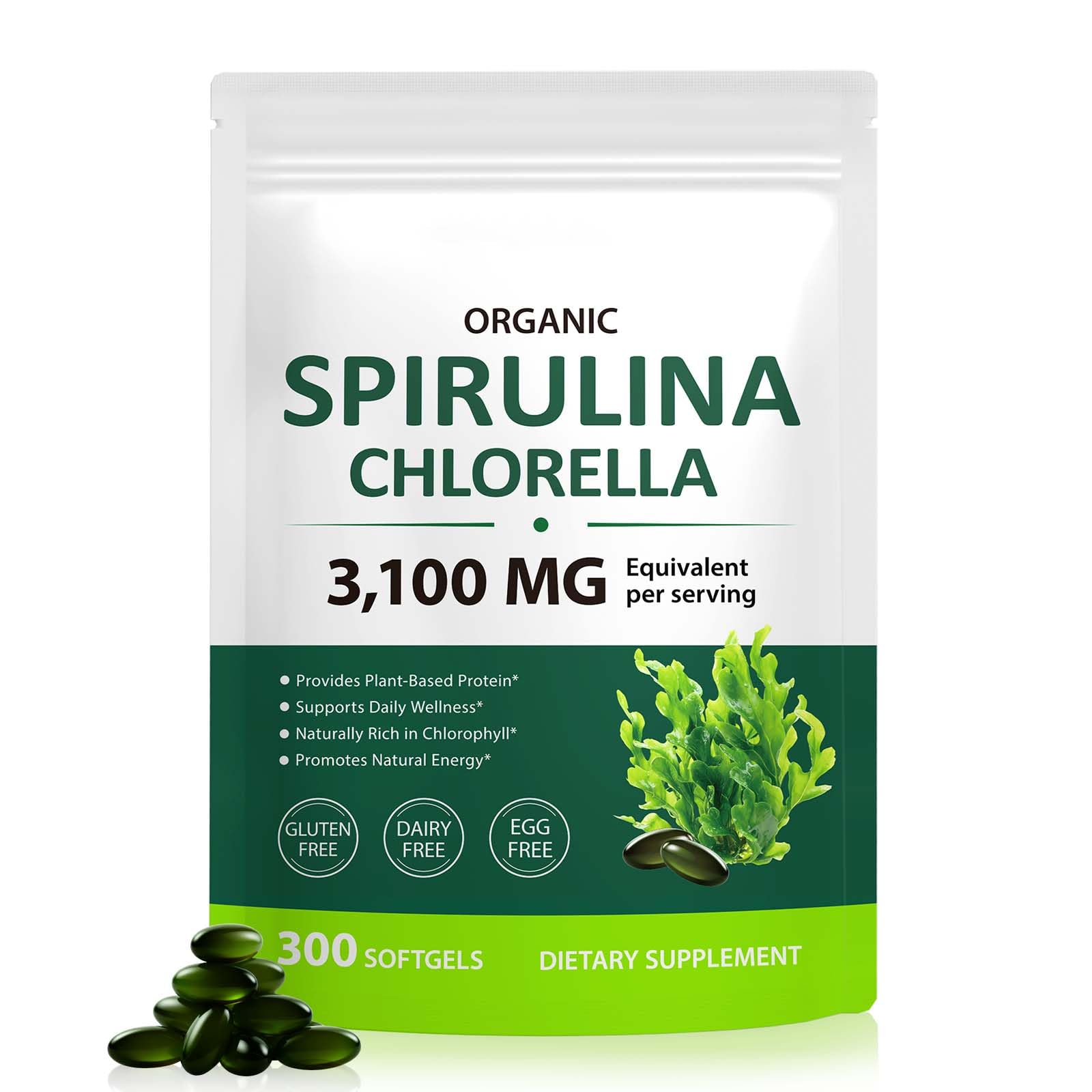 VOGSIG Spirulina Chlorella Capsules 3100MG Per Serving 17-in-1 Supergreens Blend Rich in Protein Chlorophyll Vitamins Supports Energy Immune & Gut Health Easy Absorption 300 Softgels