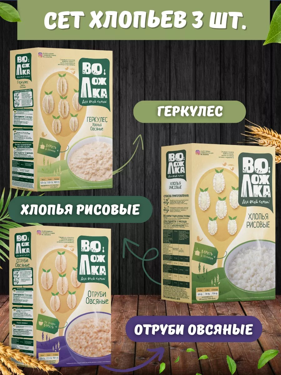 | Комплектация | 1шт - Рисовые хлопья; 1шт - геркулес; 1шт - отруби овсяные |