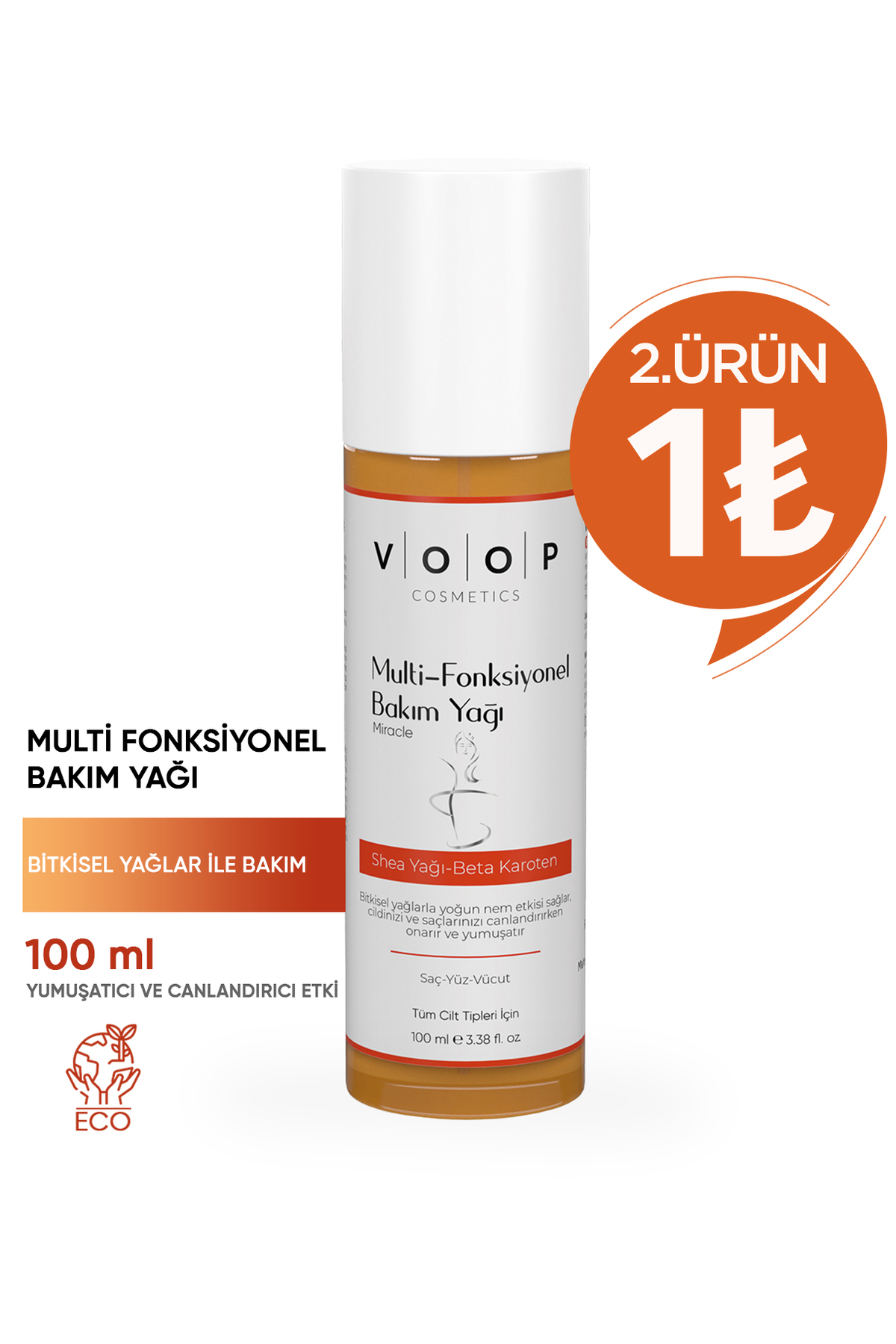 1. VOOP Multi-Fonksiyonel Bakim Yagi 100 ml Shea yagi ve Beta Karoten Içerigindeki bitkisel dogal yaglarla, cildinizi ve saçlarinizi yagli his birakmadan canlandirir, nemlendirir ve onarir.