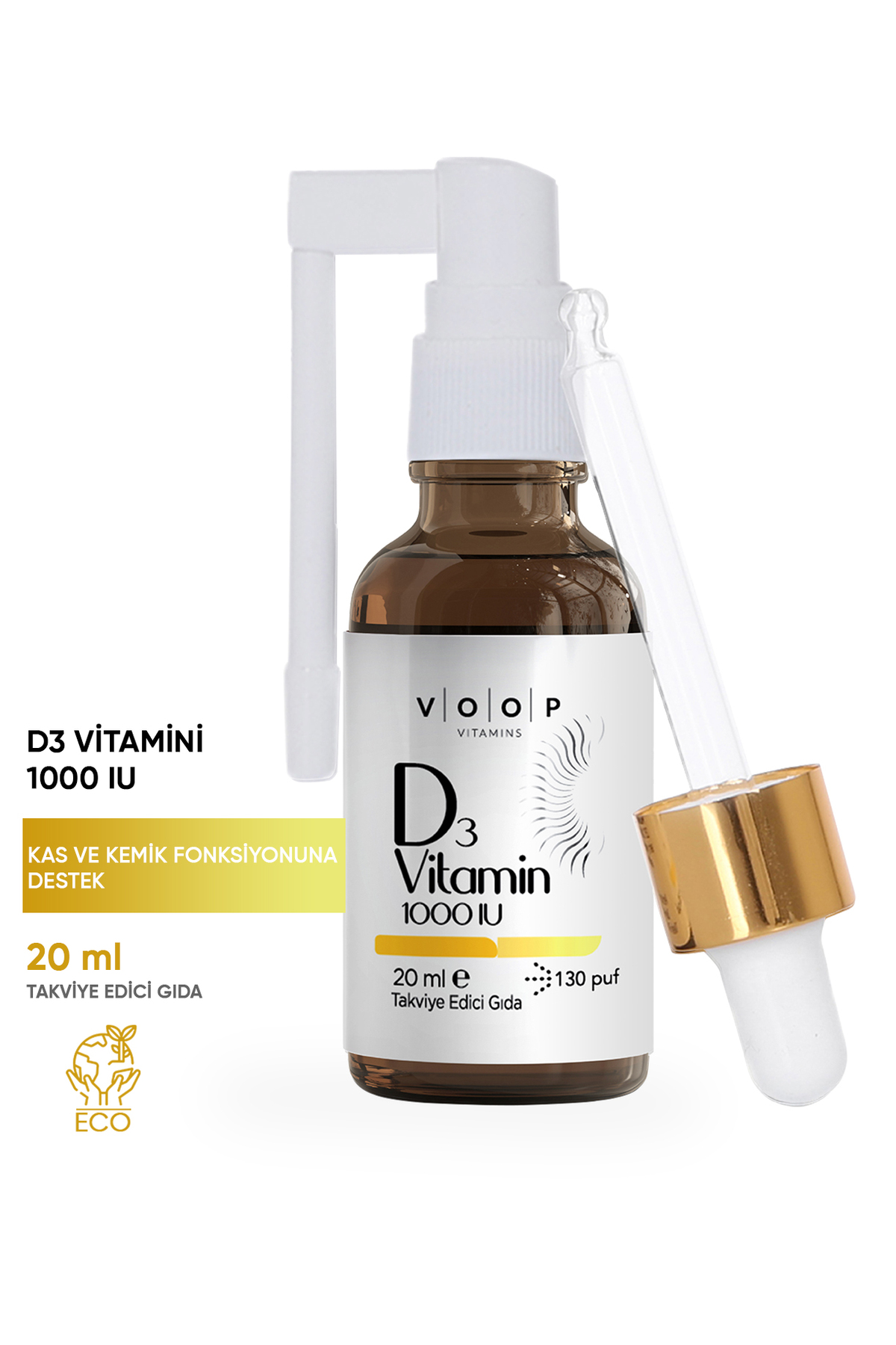 VOOP Vitamin D3 1000 IU Spray includes a 20 ml spray and dropper.