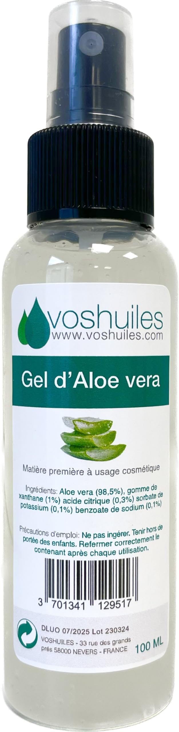 DESCRIPTION DU PRODUIT DESCRIPTION DU PRODUIT Le gel d'aloe vera est composé de 98,5 d'aloe vera pur afin d'apporter tous les bienfaits de cette plante dans une concentration maximale. La méthode d'extraction respectueuse des propriétés de la plante fait de ce gel un ingrédient cosmétique de haute qualité. La gomme de xanthane (gélifiant) et les conservateurs utilisés sont naturels et permettent à ce gel de durer dans le temps pour toutes vos utilisations MODE D'EMPLOI Refermer correctement le contenant et stocker dans un endroit à l'abri de la lumière et de la chaleur, au frais et au sec. Précautions d'utilisation Se laver les mains avant et après utilisation. Ne pas laisser à la portée des enfants. Ne pas ingérer