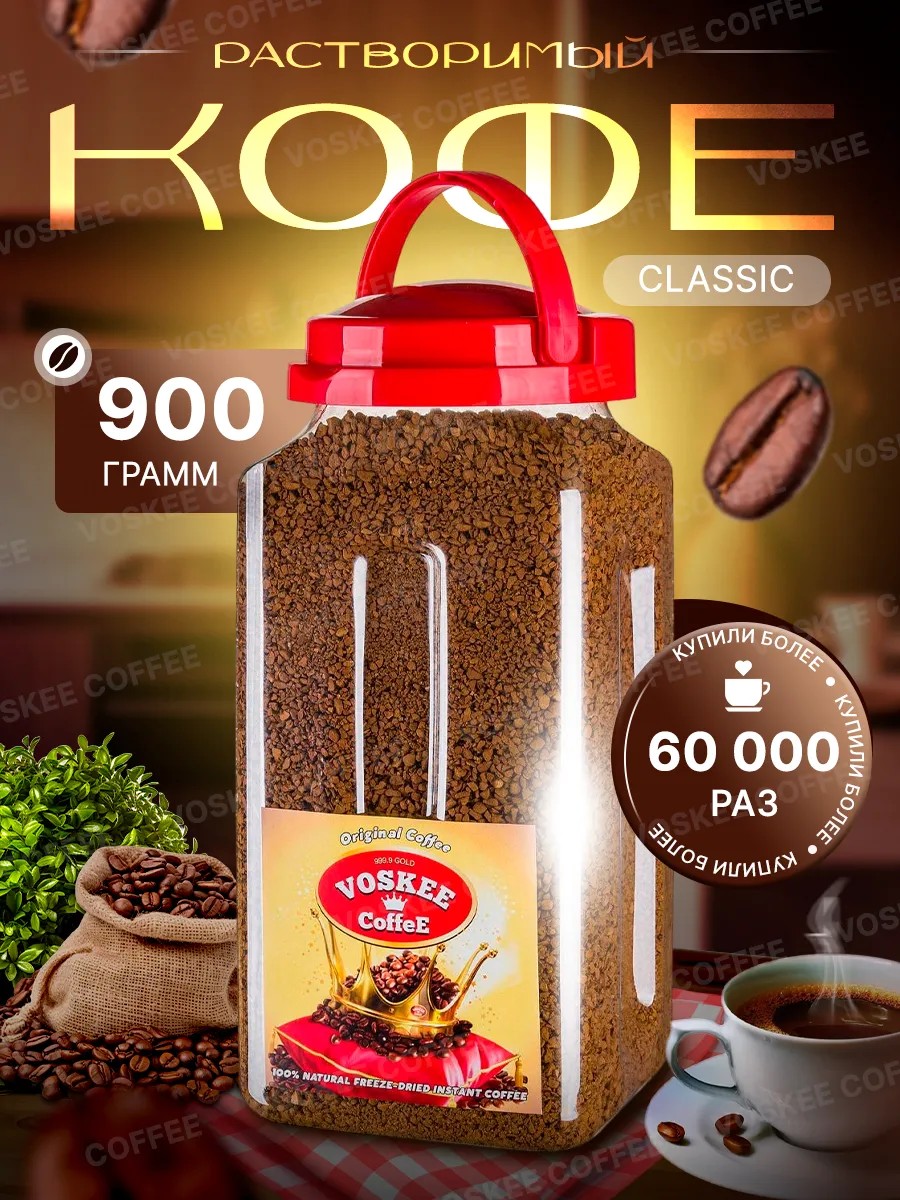 Растворимый кофе сублимированный от Voskee Coffee — это 100% натуральный продукт, который подарит вам истинное наслаждение. Этот кофе изготовлен из тщательно отобранных зёрен арабики и робусты, что обеспечивает его богатый классический вкус и притягательный аромат. В упаковке весом 900 граммов вы найдёте напиток, который станет вашим верным спутником в любое время дня. Сублимированный растворимый кофе Voskee Coffee отличается высоким качеством и популярностью среди ценителей этого напитка. Его насыщенный вкус и неповторимый аромат создают особую атмосферу уюта и комфорта. Каждая чашка этого кофе окутывает вас волнующим ароматом, даря бодрость на весь день. Приготовление растворимого кофе не требует много времени: достаточно добавить 1-2 чайные ложки продукта в чашку и залить горячей водой — ваш идеальный напиток готов! Это делает его незаменимым для тех, кто ценит своё время. Этот растворимый продукт идеально подходит как для тихих утренних часов с книгой в руках, так и для шумных встреч с друзьями или коллегами. Он станет отличным выбором как дома, так и в офисе благодаря своей универсальности. Voskee Coffee предлагает вам не просто напиток — это целая культура потребления качественного растворимого кофе! Попробуйте этот замечательный продукт уже сегодня.