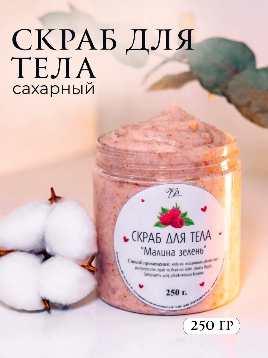 Скраб для тела "Малина зелень - отличное средство для очищения, увлажнения и регенерации кожи. СО₂-экстракт граната — стимулирует обновление клеток, улучшает эластичность и упругость кожи. Масло виноградной косточки - глубоко увлажняет кожу, предотвращая ее сухость, пудра вишни питает кожу природными витаминами, косточки малины увеличивают приток крови, дополнительно насыщают кожу кислородом, оказывают подтягивающий эффект.Использование сахарного скраба повышает защитные функции кожи, укрепляет кожный барьер, способствует разглаживанию морщин и улучшению общего состояния кожи.