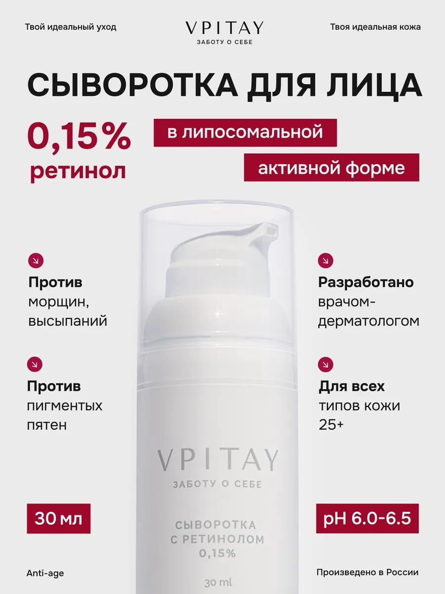 Сыворотка крем с ретинолом VPITAY мощное антивозрастное средство для ухода за кожей лица. Она эффективно борется с морщинами, увлажняет и выравнивает тон кожи, обеспечивая здоровый и молодой вид. Подходит для всех типов кожи, включая чувствительную.