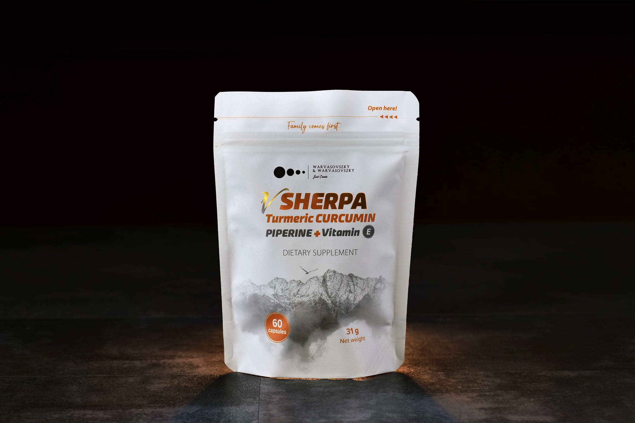 vSherpa Turmeric Curcumin supplement pouch with capsules and orange flower.