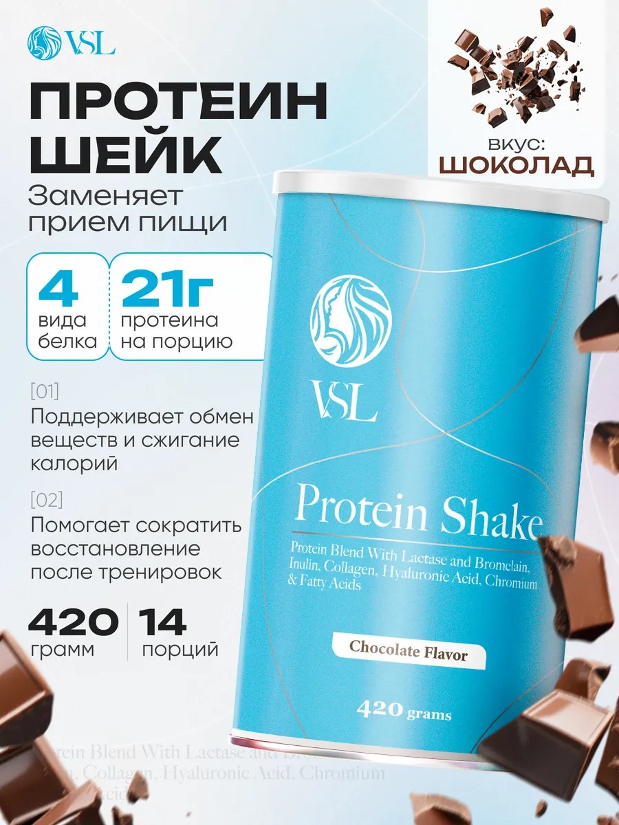 | Полное наименование товара | VSL Protein Shake 420 г – протеиновый коктейль с коллагеном, гиалуроновой кислотой и мультибелковой формулой с шоколадным вкусом |
