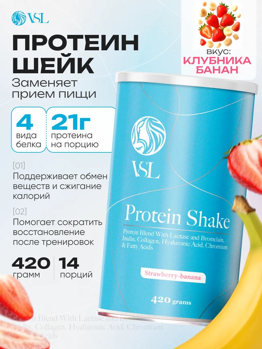 VSL Protein Shake со вкусом "клубника-банан"– это протеиновый коктейль с коллагеном, гиалуроновой кислотой и мультибелковой формулой.