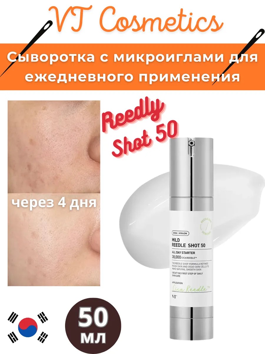 VT Cosmetics Mild Reedle Shot 50, a daily microneedle booster serum, replenishes moisture, nourishes the skin with vitamins and minerals, provides antioxidant protection, and prevents age-related changes. With regular use, the microrelief is smoothed, reducing the size and depth of pores, and diminishing wrinkles caused by dryness and expression lines.