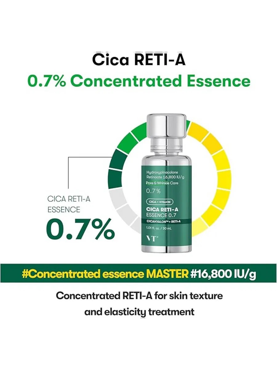 VT Cosmetics Cica Reti-A Essence 0.7, a booster essence with a high concentration of retinol and centella, intensively stimulates epidermal cell renewal, accelerating the natural processes of keratinization and exfoliation.