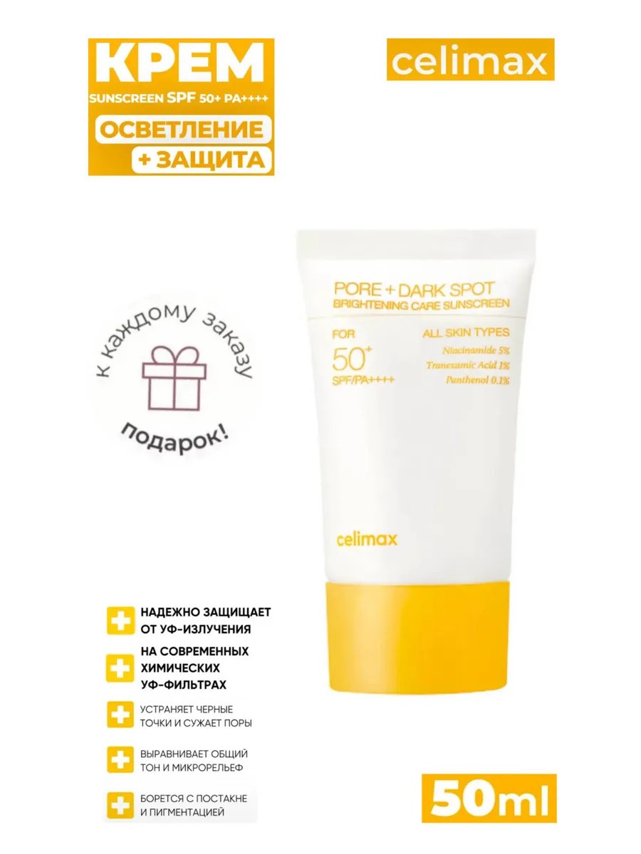 Крем Celimax Pore+Dark Spot Brightening Care Sunscreen SPF50+ PA++++ сочетает в себе защиту от ультрафиолета и осветляющее средство. Уровень pH 5.5~7.5.
