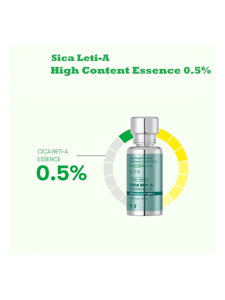 Интенсивная бустер-эссенция VT Cosmetics Cica Reti-A Essence 0.5 активирует процесс клеточного обновления, тем самым улучшает рельеф кожи: сужает поры, осветляет постакне, уменьшает глубину морщин, выравнивает тон.