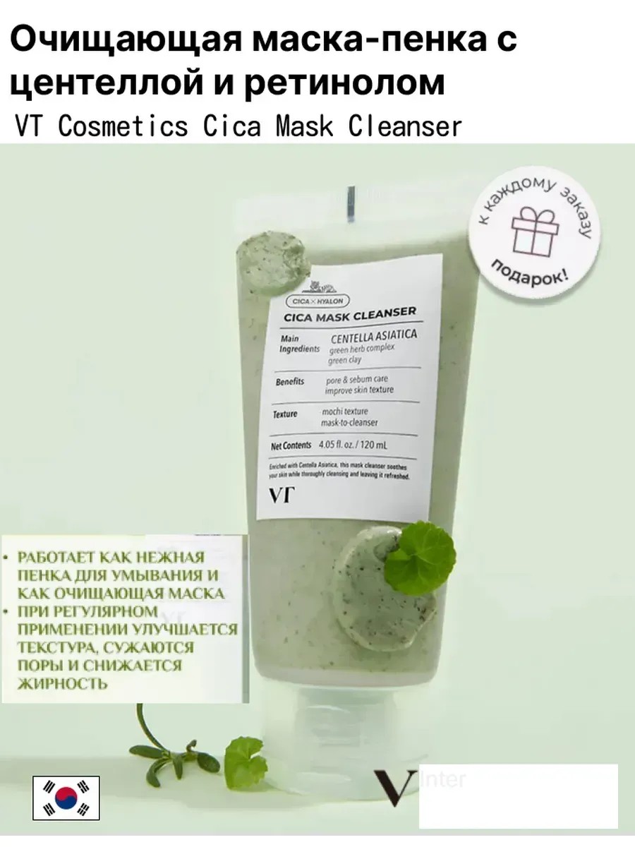 Очищающая маска-пенка с центеллой и ретинолом VT Cosmetics Cica Mask Cleanser — это универсальное средство с эластичной текстурой, которое работает как нежная пенка для умывания и как очищающая маска. Плотная, тягучая текстура плотно прилегает к коже, вытягивает загрязнение из пор и при добавлении воды превращается в мягкую пену.