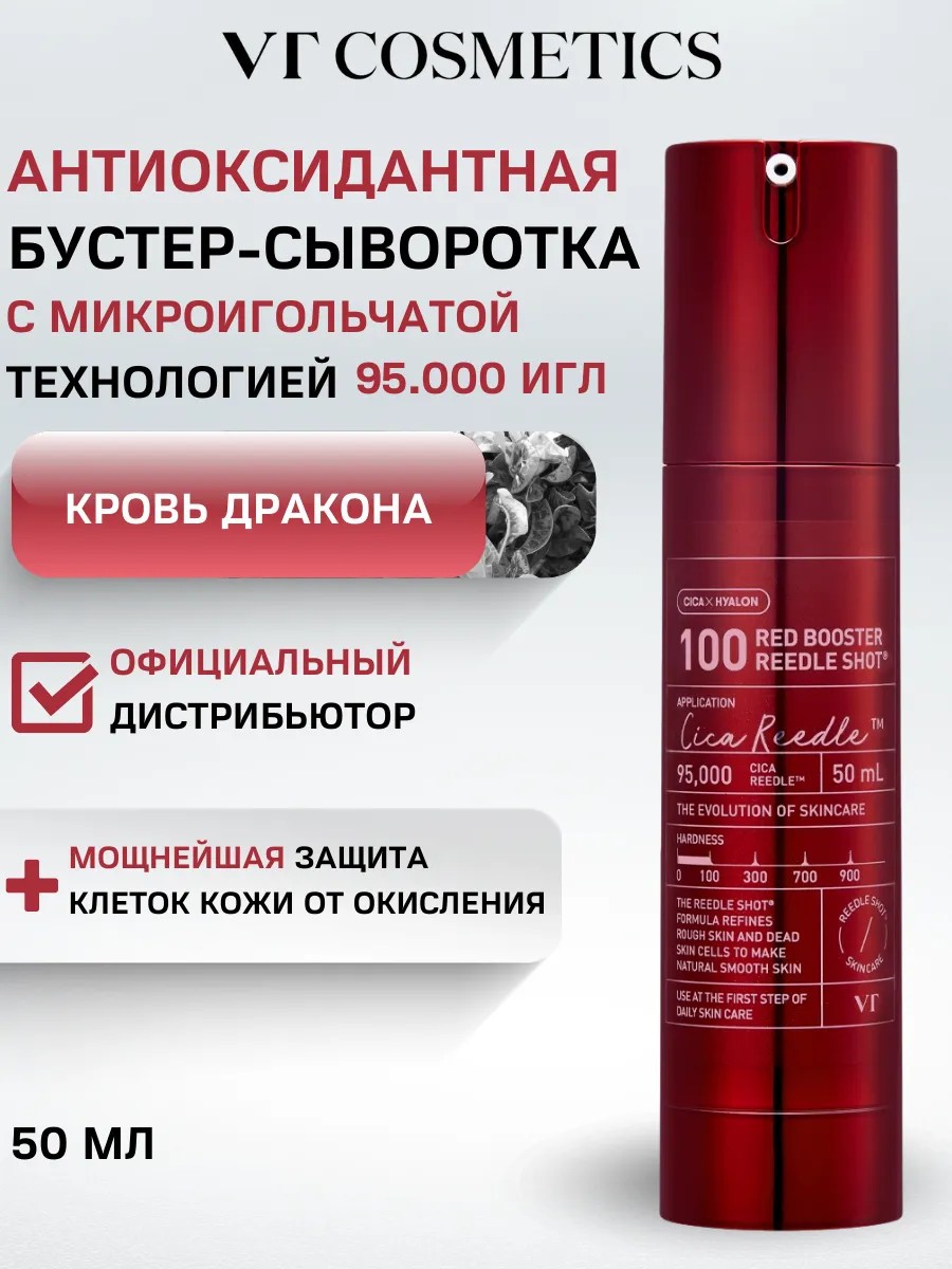 Подарите своей коже глубокое увлажнение с антивозрастной сывороткой для лица с микроиглами VT Cosmetics Red Booster Reedle Shot 100. Инновационная корейская косметика содержит рабочую концентрацию игл, за счёт чего стимулирует обновление кожи, повышает её упругость и эластичность, дарит мощный омолаживающий эффект. Продукт также содержит уникальный компонент - экстракт смолы кротонового дерева, которое также называется кровь дракона. Этот компонент снимает отеки на лице, работает как антиоксидант, снимает воспаления и выравнивает тон. За счёт этого компонента увлажняющая сыворотка имеет красный цвет. Формула с ниацинамидом и прополисом эффективно уменьшает жирный блеск и способствует сужению пор, избавляя от черных точек и улучшая текстуру кожи. Успокаивающий экстракт центеллы создает надежный барьер для защиты вашей кожи от негативных факторов окружающей среды. Сыворотка для лица из Кореи также обладает лифтинг-эффектом, придавая вашей коже здоровое сияние и упругость. Продукт подходит для кожи 50+, его можно использовать для сухой или чувствительной кожи. Идеальный подарок для женщины на день рождения или любой другой праздник для качественного ухода за кожей.