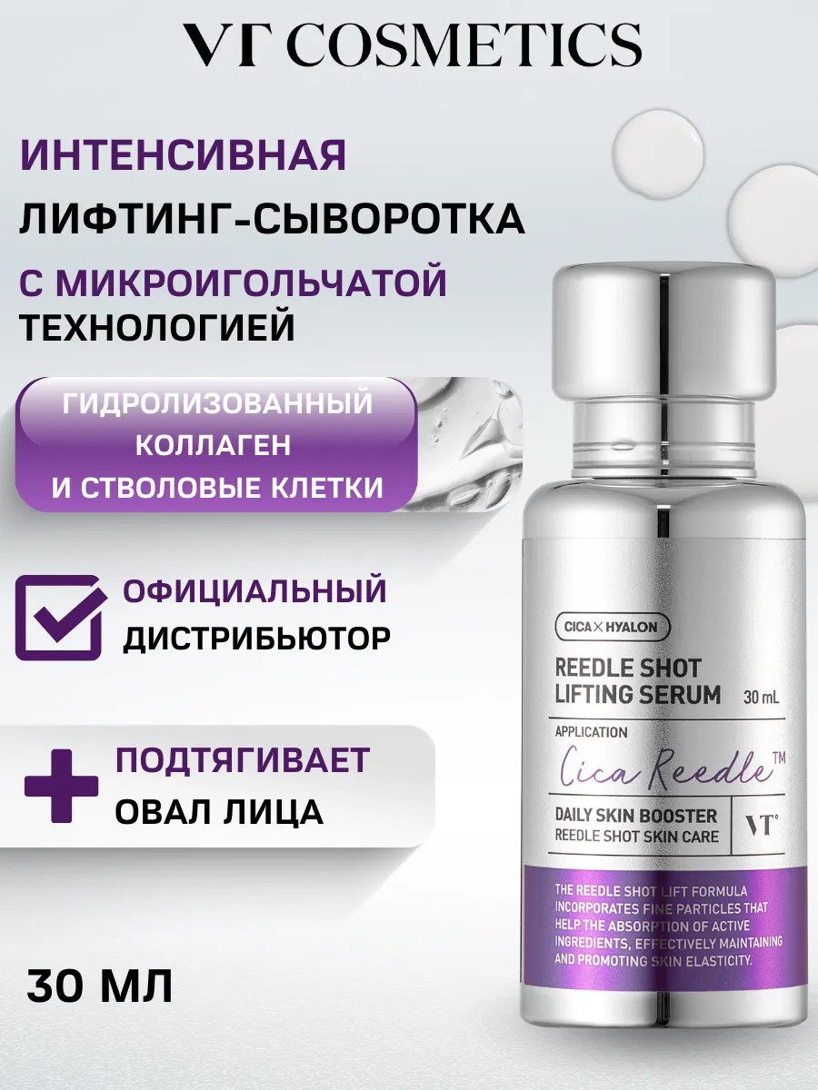 Подарите своей коже непревзойденное увлажнение с антивозрастной сывороткой для лица VT Cosmetics Reedle Shot Lifting Serum. Эта инновационная корейская косметика предлагает вам самые мощные активные компоненты для вашей красоты. Сыворотка содержит микроиглы и стволовые клетки, которые повышают упругость и эластичность кожи, уменьшают глубину морщин. Мощный лифтинг эффект также оказывают такие компоненты как коллаген и эластин. За счёт содержания центеллы и гиалуроновой кислоты, средство успокаивает кожу, снимает воспаления, обеспечивает глубокое питание и восстановление. Формула сыворотки содержит ниацинамид, который эффективно уменьшает жирный блеск и способствует сужению пор, избавляя от черных точек и улучшая текстуру кожи. Волюфилин помогает бороться с пигментными пятнами, выравнивает тон и рельеф кожи. Подходит для возрастной кожи 50 +, а также для комбинированной кожи. В паре с увлажняющими продуктами можно использовать на сухой коже. Омолаживающая сыворотка для лица, произведённая в Корее - это идеальный подарок для женщины на день рождения или любой другой праздник. Подарите вашей коже рабочий уход за кожей вместе с VT Cosmetics.