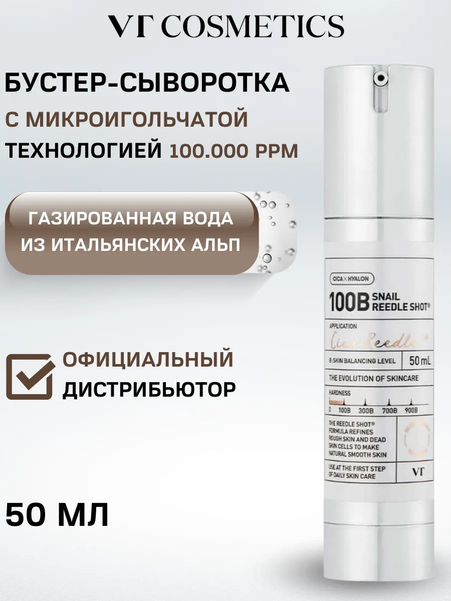 Discover unique skincare with the innovative VT Cosmetics Snail Reedle Shot 100B facial serum, designed for deep hydration and restoration. This Korean cosmetic combines advanced technology and natural ingredients to give your skin firmness, smoothness, and elasticity. Formulated with 21% snail mucin, this product actively combats wrinkles, improving skin texture and restoring a healthy, radiant appearance. Snail mucin is known for its rejuvenating properties; it promotes cell regeneration, smoothes fine lines, and improves tone. The product's key component is centella microneedles. They facilitate deep penetration of the active ingredients into the epidermal layers. This maximizes the product's effectiveness: skin becomes firmer and more elastic. This powerful anti-aging facial treatment helps minimize the signs of aging. The 17 amino acids in the formula deeply nourish the skin and strengthen its protective barrier. Squalane strengthens the skin's protective barrier, providing gentle hydration without a greasy or sticky feeling. This ingredient acts as a natural humectant, maintaining optimal hydration levels throughout the day. Combined with snail secretion, it protects against inflammation, prevents breakouts, and eliminates signs of fatigue. Ideal for use under makeup: its lightweight texture absorbs quickly without leaving a residue, smoothing the skin's surface for flawless makeup application. Regular use helps preserve youthful skin, leaving it smooth and well-groomed. If you're looking for effective anti-wrinkle care with the added benefit of correcting imperfections, this product is your perfect choice!