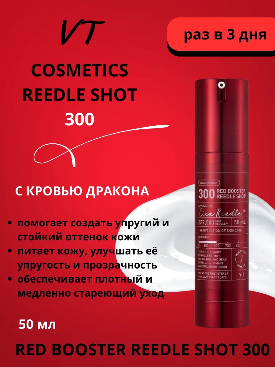Интенсивный бустер с микроиглами и антиоксидантами VT Cosmetics Red Booster Reedle Shot 300 отшелушивает ороговевшие клетки и выравнивает микрорельеф, смягчает огрубевшие участки кожи. Обладает выраженным антивозрастным действием, стимулирует синтез коллагена и эластина, повышая тургор. Способствует разглаживанию заломов и уменьшает глубину морщин. Содержит экстракты драконового дерева, центеллы азиатской и зелёного прополиса, арбутин и аденозин.