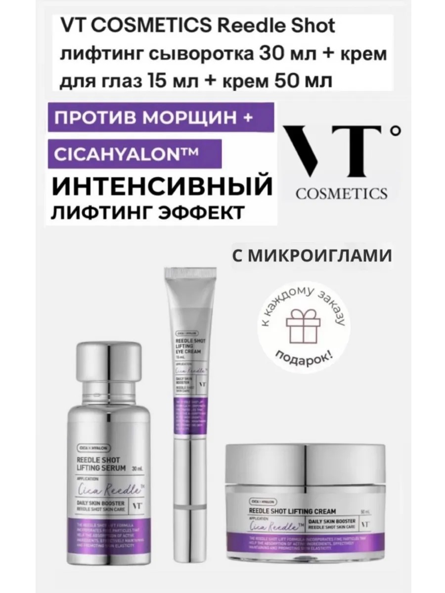 Запатентованная технология CicaReedle — комбинация вытяжки из центеллы азиатской и микроигл (спикул) — позволяет транспортировать активы средства максимально глубоко в клетки. Микроиглы в 15 раз меньше размера пор, а их оболочка содержит до 14 видов различных минералов, необходимых для подавления воспаления и улучшения кислородного обмена. Интенсивный лифтинг-крем с микроиглами VT Cosmetics Reedle Shot Lifting Cream обладает ботулоподобным действием, уменьшает глубину морщин и предотвращает образование новых. Способствует уплотнению кожи и повышению тургора, восстанавливает упругость и эластичность.
