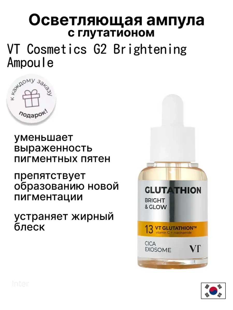 Ампула VT Cosmetics G2 Brightening Ampoule уменьшает выраженность пигментных пятен и следов от акне, выравнивает тон и придаёт здоровое сияние.