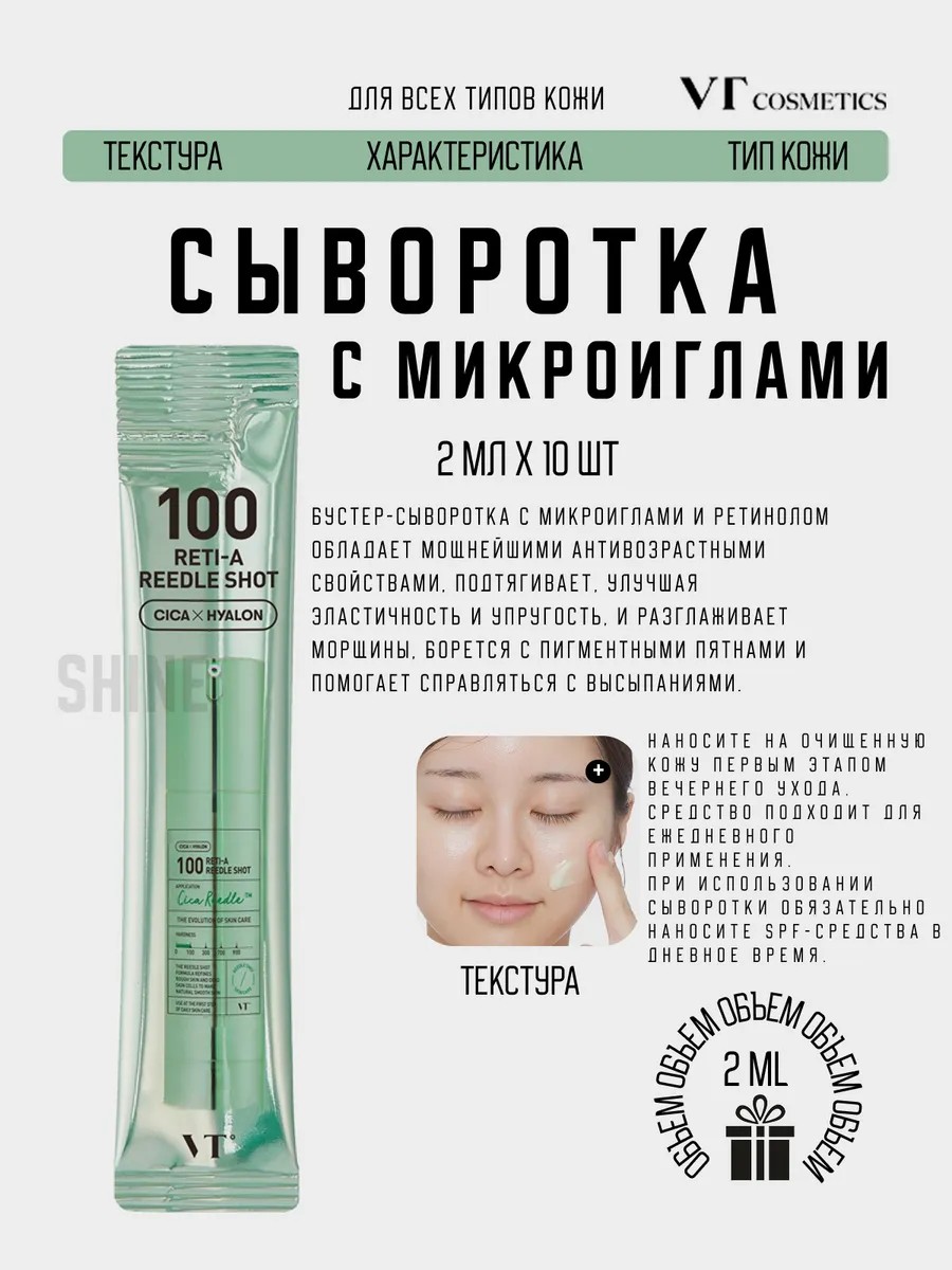 Бустер-сыворотка VT Cosmetics Reti-A Reedle Shot 100 стимулирует обновление клеток, за счёт чего разглаживает рельеф: сокращает видимость морщин и пор, уменьшает пигментацию, борется со следами постакне.
