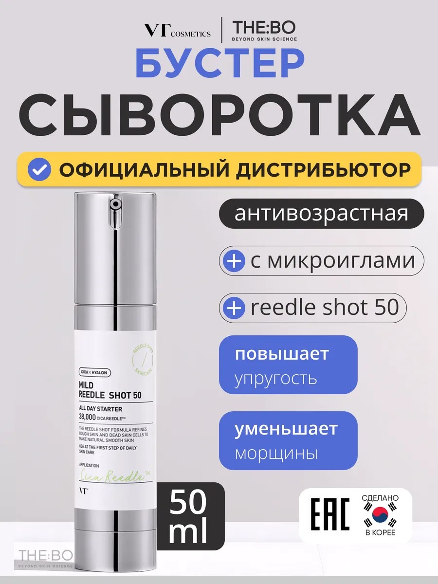 Бустер-сыворотка с микроиглами VT Cosmetics Mild Reedle Shot 50 — инновационное решение для восстановления и оздоровления кожи. Сыворотка обладает уникальной формулой, усиленной комплексом Cicahyalon, и использует микроигольчатую технологию CicaReedle (38 000 ppm), что обеспечивает доставку активных компонентов в глубокие слои эпидермиса. Микроиглы в составе на 14 раз меньше размера пор, что способствует ускорению заживления и улучшению кислородного обмена.