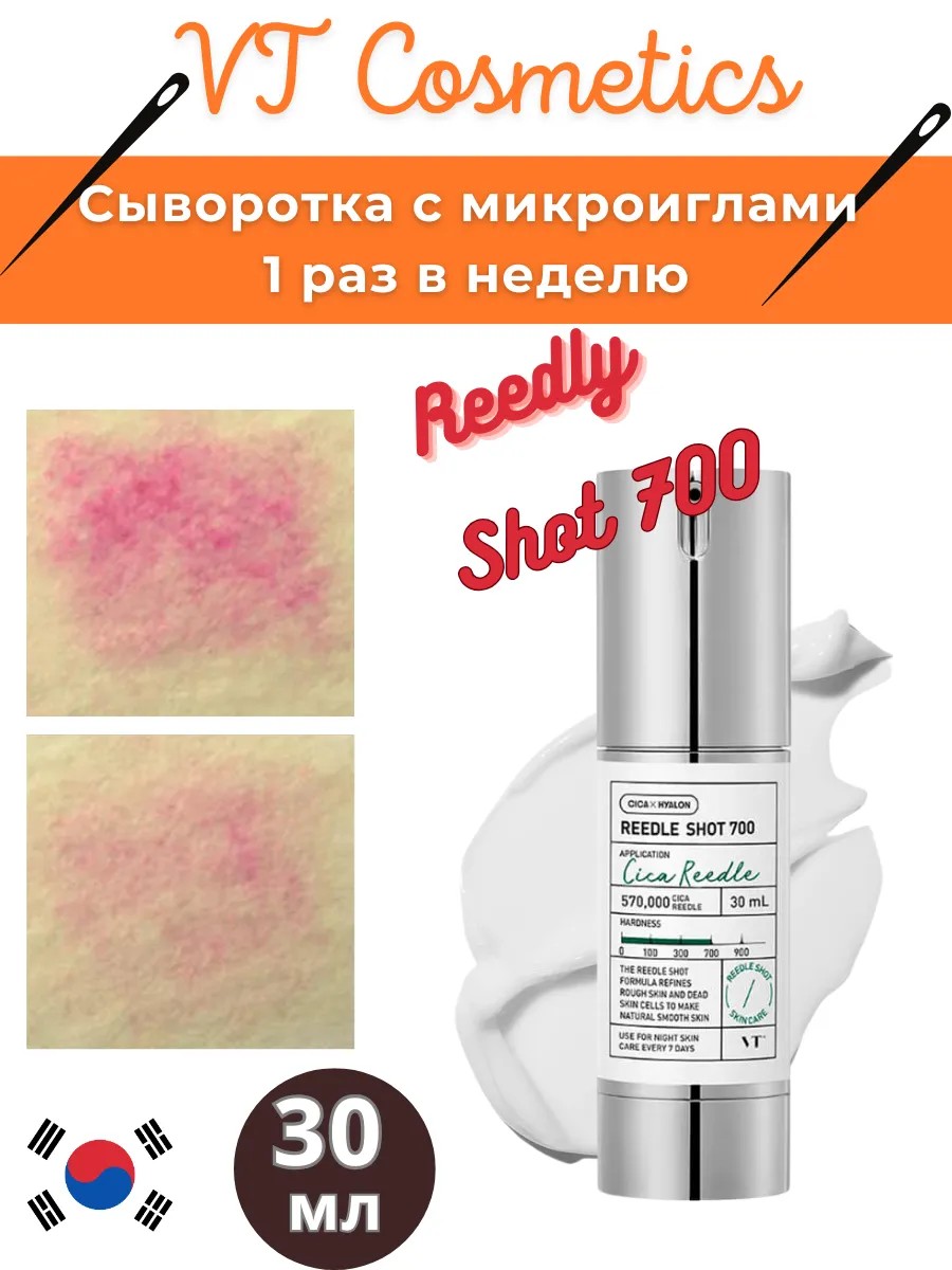 Ночная сыворотка-бустер с микроиглами VT Cosmetics Reedle Shot 700 оказывает действие, по результату схожее с процедурой микронидлинга — стимулирует процессы естественного обновления эпидермиса благодаря отшелушиванию и восстановлению рогового слоя. Средство ускоряет кровообращение и клеточный обмен, уменьшает отёчность и птоз тканей, сокращает морщины и заломы, подтягивает овал лица.