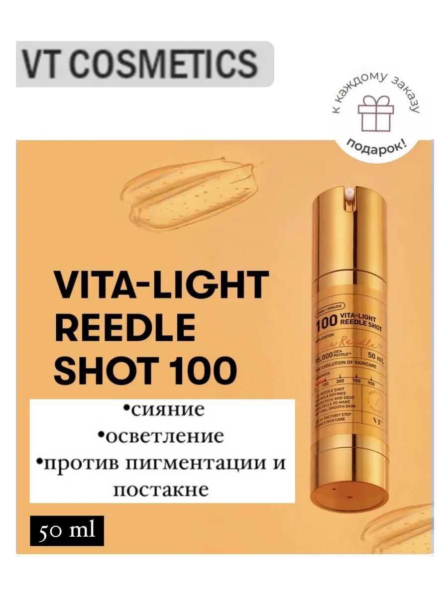 VT Cosmetics Vita-Light Reedle Shot 100 оказывает антиоксидантное воздействие, восстанавливает обменные процессы, разглаживает микрорельеф, выравнивает кожные заломы, обеспечивает глубокую гидратацию, устраняет пигментацию.