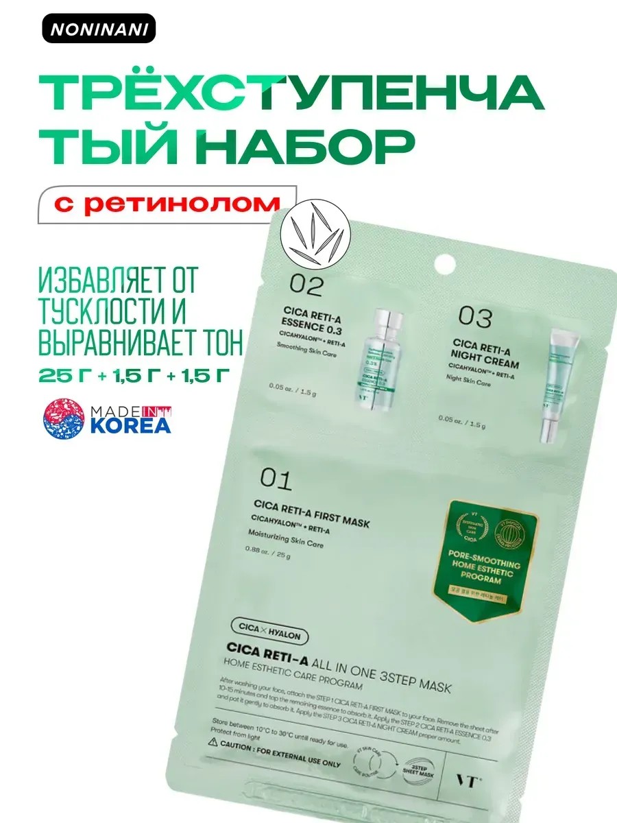 Трехэтапная маска VT Cica Reti-A All In One, которая помогает осветлить кожу и уменьшить видимость морщин.