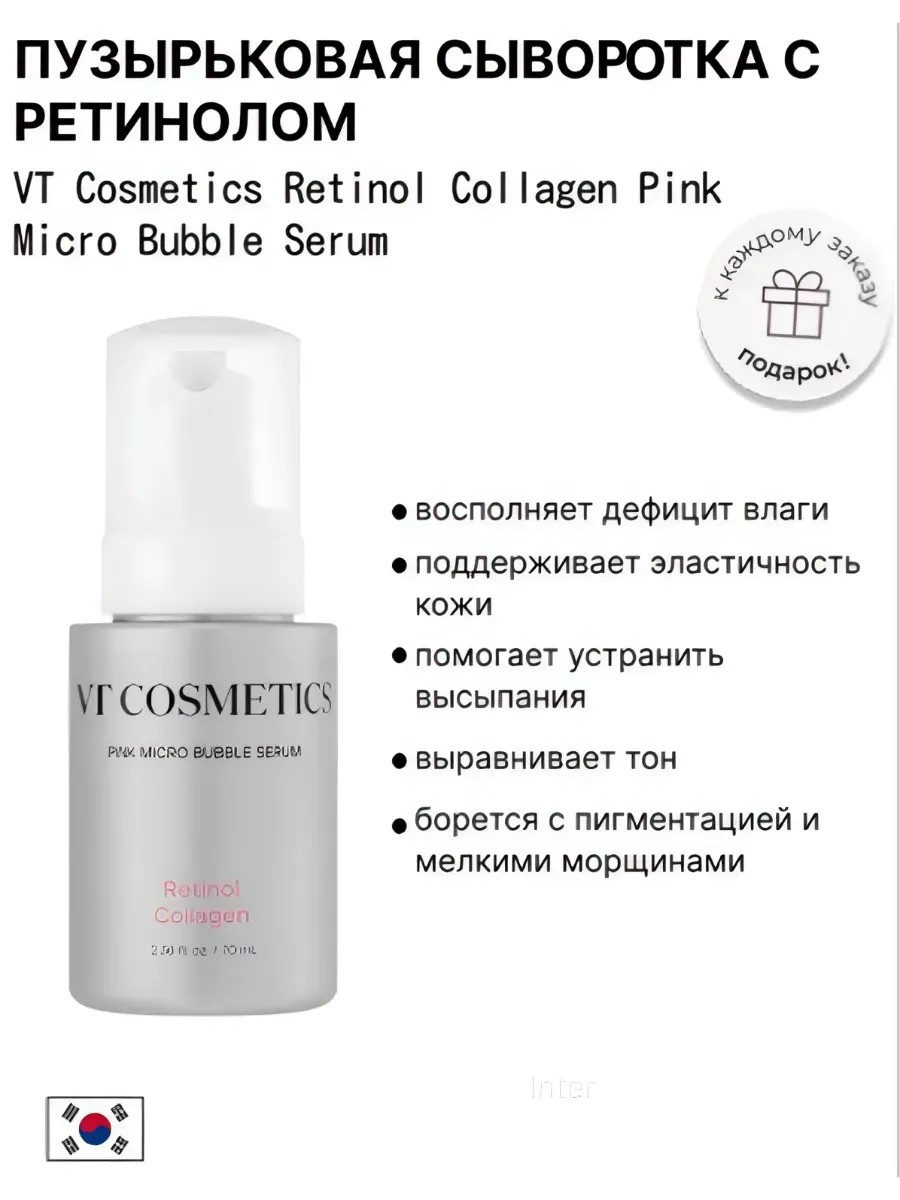 Пузырьковая сыворотка VT Cosmetics Retinol Collagen Pink Micro Bubble Serum обладает антивозрастным действием, способствует обновлению клеток.