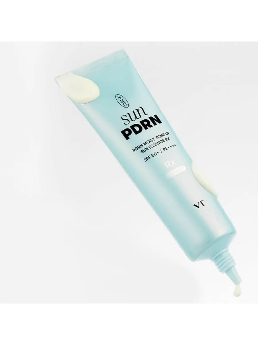 Солнцезащитная эссенция VT Cosmetics PDRN Moist Tone Up Sun Essence RX SPF50+ PA++++ сочетает антивозрастной уход, средство для защиты от ультрафиолета и базу под макияж.