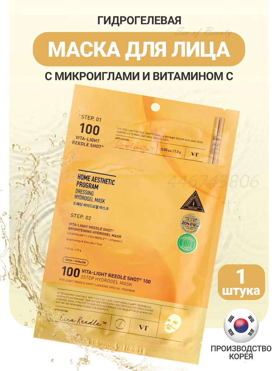 Гидрогелевая маска с микроиглами VT Cosmetics Vita-Light Reedle Shot 100 2Step Hydrogel Mask с высокой антиоксидантной активностью тонизирует и улучшает цвет лица, возвращает ему здоровое сияние. Мягко осветляет гиперпигментацию и постакне, избавляет от тусклости и выравнивает тон.