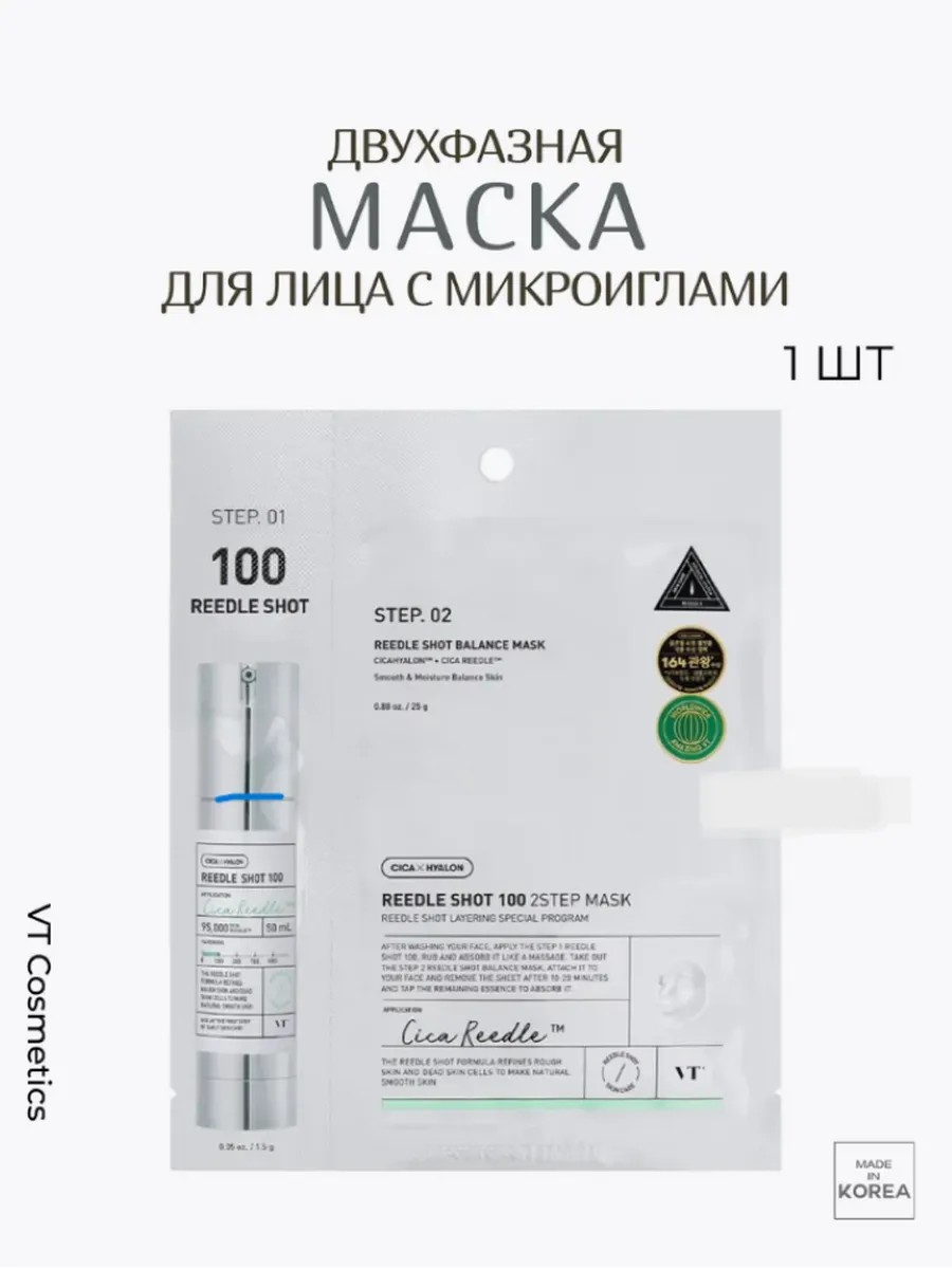 Балансирующая двухфазная маска с микроигламиVT Cosmetics Reedle Shot 100 2 Step Mask восполняет недостаток влаги и восстанавливает оптимальный гидролипидный баланс.