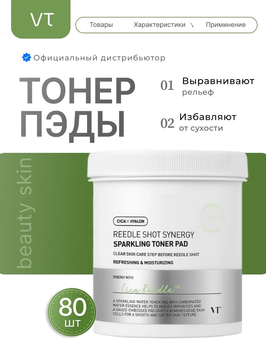 VT Cosmetics Reedle Shot Synergy Sparkling Toner Pads cleanse the skin of excess sebum, remove dead skin cells, and even out the skin's microrelief.